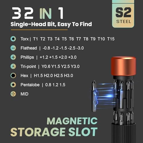 - 【32-In-1 Precision Screwdriver Set】 Includes: Philips PH000 (+1.2) PH000 (+1.5) PH00 (+2.0) PH0 (+3.0); Flathead -0.8 -1.2 -1.5 -2.5 -3.0; Torx T1 T2 T3 T4 T5; Torx Security TR6 TR7 TR8 TR9 TR10 TR15; Tri-point Y000 (Y0.6) Y00 (Y1.5) Y0 (Y2.5) Y1 (Y3.0);Pentalobe P2(0.8) P5(1.2) P6( 1.5); Hex H1.5 H2.0 H2.5 H3.0; MID 2.5.