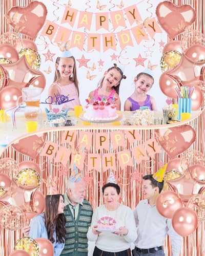 Rose Gold Happy Birthday Party Decorations, Happy Birthday Banner, Rose Gold Foil Heart Star Confetti Balloons Curtain Backdrop Hanging Swirls Party Decor for Girls Women Princess