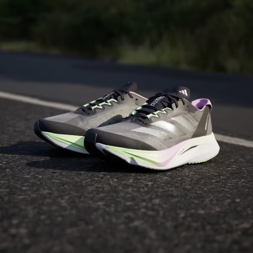FAST-TEMPO TRAINING SHOES WITH HIGH PERFORMANCE TECHNOLOGY. The Boston Marathon is a race. But it's also a goal, and a training plan and all the days it stays on your mind before the big one. The Adizero Boston 12 Shoes are built for mid- to long-distance running. They bring a race-day feel to training with a propulsive feel that comes from the glass-fiber infused ENERGYRODS 2.0, which limit energy loss underfoot. They're fast, but that does not come at the cost of durability - the midsole layers ultra-light LIGHTSTRIKE PRO cushioning with a new version of durable LIGHTSTRIKE 2.0 EVA. Regular fit Lace closure Lightweight mesh upper Textile lining ENERGYRODS limit energy loss Lightstrike Pro cushioning Weight: 9.4 ounces (size 9) Midsole drop: 7 mm (heel: 38 mm / forefoot: 31 mml Continental Rubber outsole Upper contains a minimum of 50% recycled content Imported Product color: Aurora Black / Zero Metalic / Green Spark