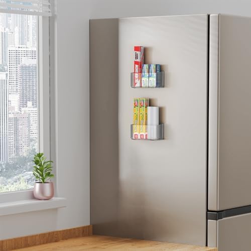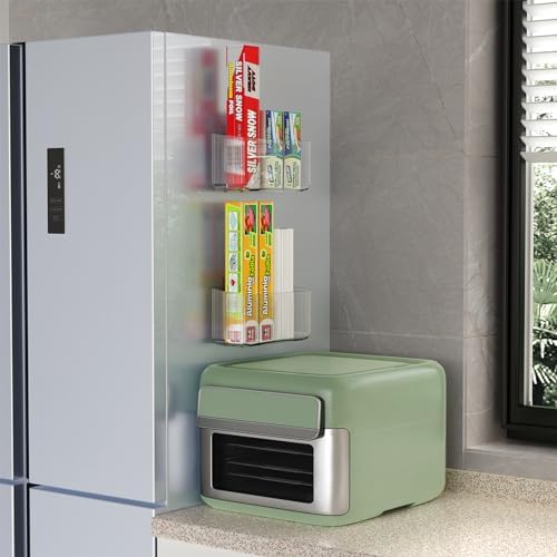 - Tamaño Portátil y Versatilidad: Con dimensiones de 9.25 (L) x 4.13 (W) x 4.33-4.72 (H) pulgadas, estos soportes y organizadores de envoltura de aluminio con ganchos adhesivos son ligeros y portátiles, adecuados para montaje en pared o colocación en la mesa. Perfecto para almacenar envoltura de aluminio, envoltura adhesiva y bolsas de comida.