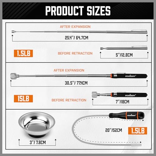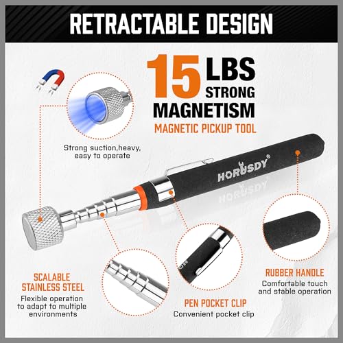 - 7 to 30.5 inch Telescoping Magnetic Pickup Tool: Magnetic pickup boast strong magnetic heads with a lift capacity of up to 15 lbs, ensuring efficient retrieval of metal objects in hard-to-reach places.