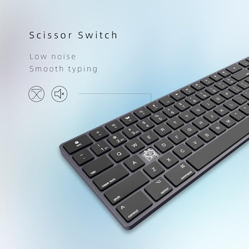 • 【ULTRA SLIM AND QUIET KEYBOARD】With low profile keys and high-end whisper-quiet scissor switch, you can enjoy comfortable and efficient typing experience. Streamlined, elegant and compact keyboard design with high quality aluminum top case takes a prominent position on your desk.