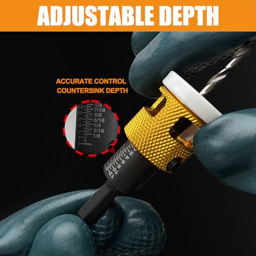 Adjustable Depth 1/8" x3/8" Countersink Drill Bit, Low Friction Stop Prevent Scratches, 1/4" Hex Shank for Quick Change, Replaceable HSS Pilot Drill Bit for Wood, Plastic, Woodworking