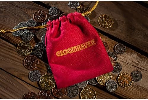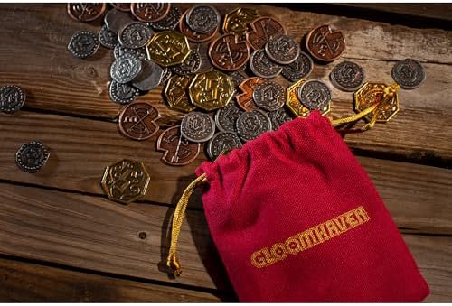 Juegos: Gloomhaven: Mejora de Moneda de Metal - 60 Monedas y Bolsa con Cordón, Accesorio de Juego de Mesa, Moneda de Metal, Arte Detallado