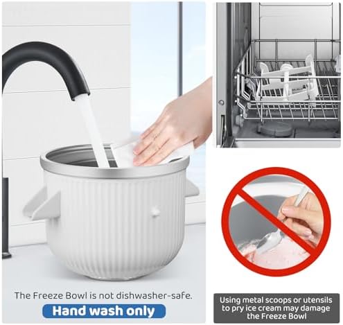 • Fácil de Limpiar -- 1 x Tazón de Congelación de Helado, 1 x Dasher, 1 x Ensamblaje de Cubo en su conjunto. El Tazón de Congelación debe lavarse a mano con agua tibia o fría, no es apto para lavavajillas. (El tazón congelador debe secarse completamente antes de colocarlo en el congelador o almacenarlo). El Dasher y el Ensamblaje de Accionamiento son aptos para lavavajillas.