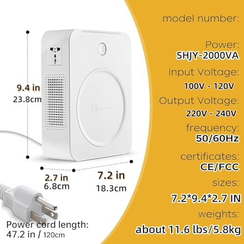 - 【Power Converter Use Range】SUNSHUN 2000W voltage transformer can step up voltage from 110v-120v to 220v, works with kinds of 220v to 240v electric appliances, devices and equipment from Europe, Asia, UK. Such as hair dryer, coffee maker, rice cooker, blender, mixer, toaster, robot vacuum and so on.