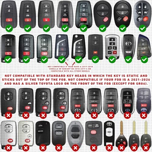 - Not compatible with standard Toyota keys in which the key is static and sticks out of the fob. Not compatible with 2021-2025 keys fobs that have a silver Toyota logo on the front of the fob (except for GR86)