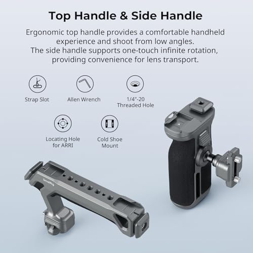 • Top Handle & Rotating Side Handle - Ergonomic top handle provides a comfortable handheld experience and allows for easy carrying of the kit and shooting from low angles. The side handle supports one-touch infinite rotation, providing convenience for lens transport.