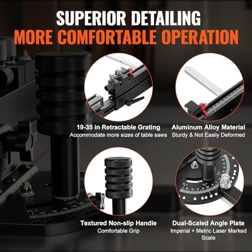 - Refined Durability in Every Detail: This precision miter gauge is constructed from aluminum alloy, ensuring durability and resistance to deformation. The 19-35 in retractable grating accommodates more sizes of table saws. The angle plate scale is meticulously etched using laser engraving technology, and the textured metal handle provides a secure grip that avoids slipping.