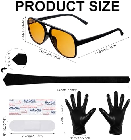 Features: Lightweight and portable, our Halloween costume for adult is convenient to carry and store, can be easily put in your bag or closet when not in use, not taking up much space. You can present the Halloween accessories costume as an ideal gift to your families, friends, colleagues, or other partners for Halloween, holidays, festivals, celebrations or anniversaries. Specifications: Material: Sunglasses: quality frame material Tie: microfiber Gloves: satin leather Woundplast: non woven fabric Color: Tie, gloves: black Woundplast: white Sunglasses: black, orange Size: Tie: about 57.09 x 3.15 inches/ 145 x 8 cm Sunglasses: about 5.71 x 5.71 x 2.17 inches/ 14.5 x 14.5 x 5.5 cm Gloves: about 8.66 x 3.15 inches/ 22 x 8 cm Woundplast: about 2.83 x 0.75 inches/ 72 x 19 mm Package includes: 1 x Retro sunglasses 1 x Black gloves 1 x Tie 5 x Woundplasts Notes: Manual measurement, please allow slight errors on size. The color may exist a slight difference due to different screen displays.