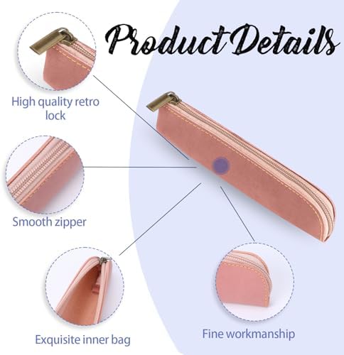 Leather Pencil Case, 2 Pcs Slim Design Small Pen Pouch, Portable Cosmetic Bag for Purse with Zipper, Flat Soft Simple Makeup Bag Lipstick Case for Women, Office, Travel, Outdoor (Grey, Pink)
