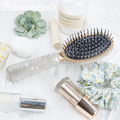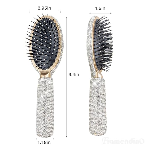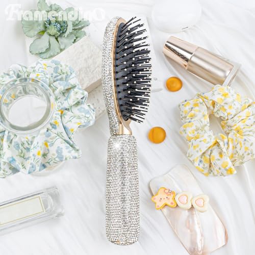 Framendino, Rhinestone Hair Brush Sparkle Compact Comb Bling Detangle Massage Crastal Air Cushion for WomenWet Dry Silver