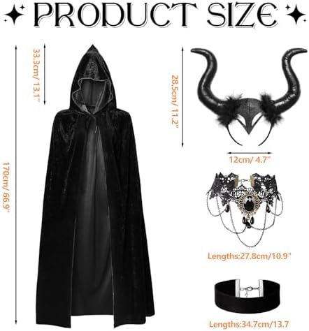 MOVINPE Meleficent Costume Evil Queen Costume for Women, Long Horns Hooded Cloak Gothic Necklace Black Choker Halloween Costume Accessories Halloween Cosplay Party Dress Up