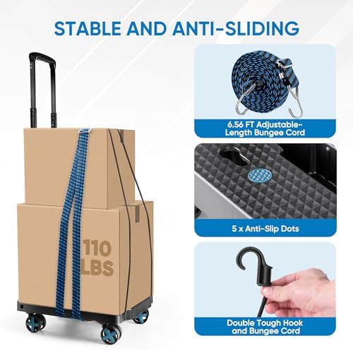 - [RETRACTABLE ELASTIC ROPE] This folding dolly includes 2 detachable elastic ropes and an additional 6.4 fts adjustable length elastic rope. These ropes are highly elastic and can hold items securely on the truck.