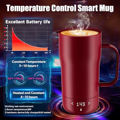 Smart Self Heating Coffee Mug 18 Oz Temperature Control Heated Coffee Mug App Controlled Warmer Mug 5-10 Hour LED Display Keep Coffee Hot All Day Fast Wireless Charger Base Rogue red