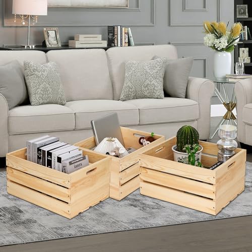 - 【Unique design】: The storage crates adopt a detachable design. Two thick panels and 10 Battens are combined by screws to make the wood crates more sturdy and durable, which is enough to withstand 50 pounds of goods. The material of the storage box has not been treated, showing its natural appearance.The wooden box is easy to install and can be assembled with only 20 screws.