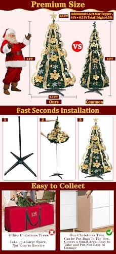 - Pop up Christmas tree: 6 Ft Christmas tree features an innovative pop-up design,There's no need for a complicated installation process, and no worries about storage spaces. When the Christmas is over, simply fold it up for storage to save you spaces