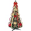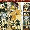 - Prelit Rich Ornaments: Christmas trees adorned with 12 gold balls, 6 gold ribbons, 12 bells, 18 snowflakes, 18 gold Christmas flowers, and 12 pine cones. Additionally a gold star and a “Merry Christmas” board, which are not prelit and require assembly