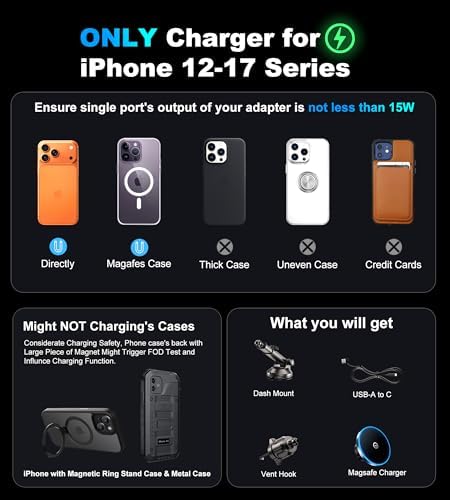 - 【Secure Magnetic Attachment】 Powerful magnets with 1,400 g of holding force and a non-slip surface keep your phone secure even on rough roads. Use an official or third-party MagSafe case for off-road adventures. Ensure the back of your Magnetic case is flat to avoid charging issues. Suitable for iPhone 12, 13, 14, 15, 16, 17 series: for iphone 17 car charger, iphone 17 pro/pro max/Air car charger, iphone 16 pro max car charger, iphone 16 pro car charger, iphone 16 car charger, iphone 15 pro max car charger, iphone 15 pro car charger, iphone 15 car charger, iphone 14 pro max car charger, iphone 14 pro car charger, iphone 14 car charger, iphone 13 car charger, iphone 12 car charger.