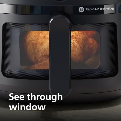 Introducing the Philips 2000 Series Airfryer 6.5 quarts, offering advanced features for a revolutionary cooking experience. Enjoy crispy exteriors and tender interiors with up to 90% less fat thanks to RapidAir technology. Monitor your food's progress effortlessly through the cooking window, ensuring each dish reaches perfection. The compact design (15.9 x 12.1 x 12.1 inch) fits any kitchen, holding up to 800g of fries, 8 chicken drumsticks, or 800g of vegetables in its 6.6 quarts pan. Take command of your cooking with the intuitive touchscreen interface. Set time and temperature manually or choose from 13 cooking presets, including reheating and defrosting, for precise temperature and time control. Explore a variety of recipes and personalized settings with the HomeID Recipe App, simplifying cooking for 93% of users. Elevate your culinary creations with the Philips 2000 Series Airfryer.