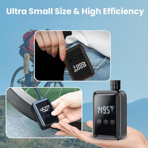 • 【Mini Portable】: This mini pump is compact and easy to carry, comes with a silicone sleeve, easy to store in your backpack or pocket. Weighing only 300g, the size of the bike pump is only 18*10*8cm. cordless design, no need for power cord, get rid of the trouble of tangled wires.