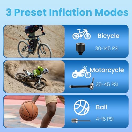 • 【150PSI High Pressure】: This portable tire inflator is small in size, but it has impressive power. Built-in high performance chip, it can inflate tires quickly and stop automatically when it is full, the maximum pressure can reach 150 PSI, depending on the type of tires, quickly inflate bike tires.