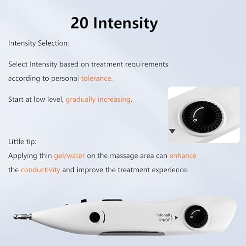 - 20 INTENSITY: Start at low intensity. Gently apply the probe to the acupuncture area and press START to initiate stimulation, then assess intensity gradually increasing to tolerance. Applying thin gel/water to the acupuncture area enhances conductivity, improving treatment efficacy.