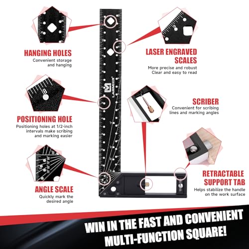 - 【Excellent Woodworking Tools】The base of the framing square is die-cast aluminum for strength and durability. The body of the ruler with the scale is cnc-machined aluminum alloy, which is 3/32" thick, and is more resistant to bending and less likely to deform compared to the thin steel body. Gives you a more perfect grip and feel of use.
