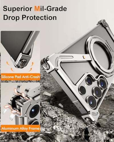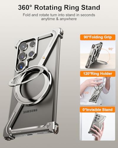 • 【Slim & Frameless Case】OGRANEE for Samsung S24 Ultra metal case adopts a frameless design, which restores the feel of the bare phone and is able to continuously dissipate heat efficiently. The Samsung Galaxy S24 Ultra case is upgraded with 4-in-1 function (360° rotatable stand, magnetic wireless charging, airbag protection, military-grade drop protection), multi-functional, highly protective, simple and fashionable, so you can enjoy the lightweight and cool fun
