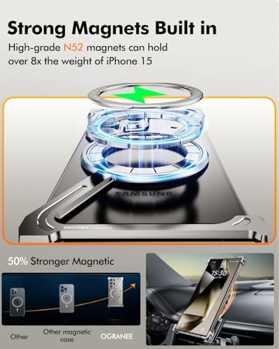 • 【Aluminum Alloy & Air Cushion Protection】OGRANEE upgraded the S24 Ultra case with a four-corner air cushion to dissipate impact, and the whole case is made of high-strength aluminum alloy with military-grade drop protection to protect the phone from drops and impacts. In the design of the S24 Ultra magsafe case, the height of the bezel is 1.5mm above the edge of the screen and 3mm above the height of the camera, which prevents the screen and camera lens from scratches and impacts when placed