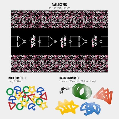 Ready to throw a killer party? Host an unforgettable Squid Game theme party with our exclusive partyware pack! Perfect for fans of the hit series, this bundle includes everything you need to immerse your guests in the thrilling, high-stakes underworld of Squid Game: Table cover (1pc) 9" plates (8pcs) 7" plates (8pcs) Guest napkins (16pcs) Cocktail napkins (24pcs) Table confetti (0.88oz) Number Tag stickers (30pcs) Hanging banner (1pc)