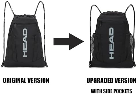 HEAD Waterproof Gym Sackpack for Sport with 2 Zipper Pockets, Large Drawstring Backpacks for Men with Side Pockets for Water Bottle