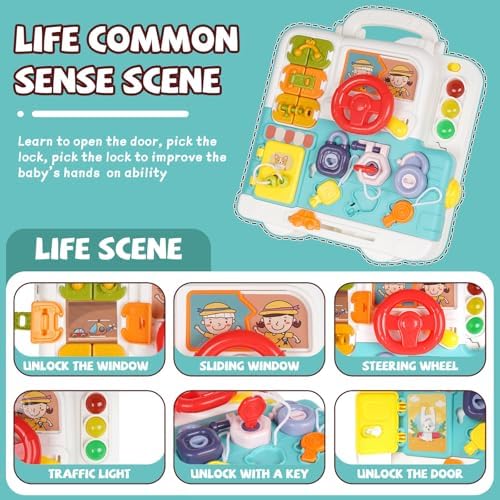 • 3-in-1 Interactive Activity Board: Our toddler montessori toys are designed with 3 sides, each packed with interactive activities including simulated driving, paired unlocking, cabinet opening, push the window, shoelace tying, doll sliding, sliding bow knot, socket operations, and more. Keeps your child entertained and engaged for hours!