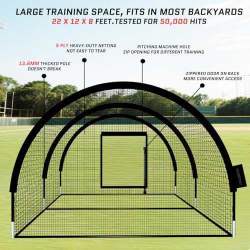 - ⚾️Perfect for Machine and Manual Throw: 22x12x8 ft baseball batting cage net have plenty of space to simulate real-competition batting scenarios. Unique zipper door with 4" x 4" pitching hole to practice with pitching machine or pitcher.