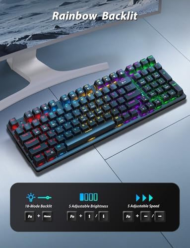 - 8 Modes RGB Backlighting: This Wireless gaming keyboard features RGB backlighting with 8 different lighting modes to choose from. The brightness and breathing speed can be adjusted to suit your preferences and gaming environment. Allowing users to personalize their setup and create an immersive gaming atmosphere