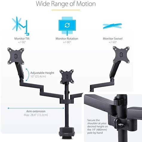 - RANGE OF MOTION: Ergonomic three-monitor mount features articulating mechanical spring arms with toolless adjustments of +/-180° horizontal swivel, +/-90° tilt, and +/-90° screen rotation for portrait and landscape orientations