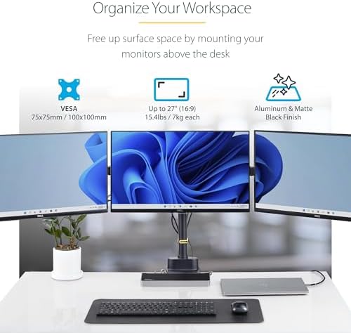 StarTech.com Desk Mount Triple Monitor Arm for Up to Three 27in Screens, VESA 75x75/100x100, Mechanical Spring Arm