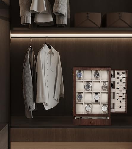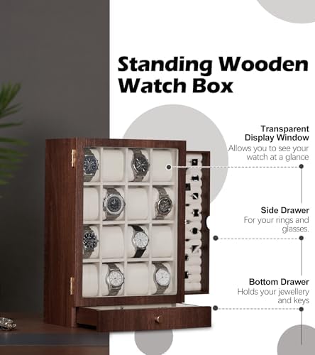 - Luxurious Wooden Watch Case: The regal wooden watch case, a majestic 10.62 x 5.9 x 17.54 inches wooden structure, purpose-built to display up to 16 exquisite watches with a 57mm dial diameter. The grand transparent window is the guardian that shields your collection from dust while putting it on display for all to admire.