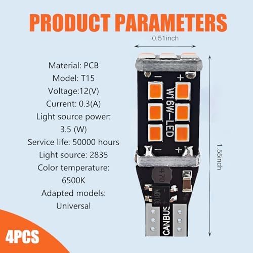 • Box Contents: You will receive four T15 2835-15SMD automotive LED decoded reverse lights. We are committed to providing you with a perfect shopping experience. If you have any usage problems, please feel free to contact us directly and we will solve the problem for you within 24 hours on working days.