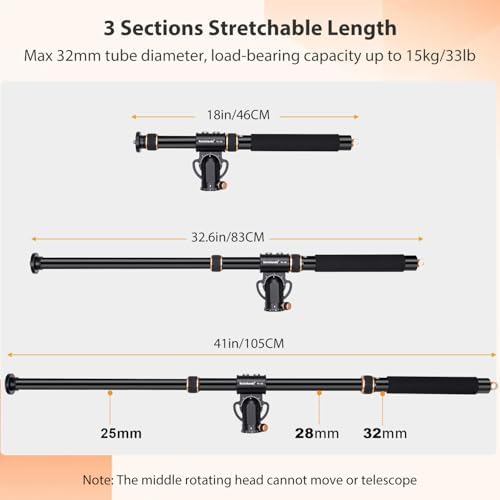• 【Stable and Sturdy】The tripod extension arm is made of durable, high-quality aluminum alloy, 32mm large diameter cross arm provides greater stability and load capacity. The arm has 3 sections that extend from 18in to 41in, and the arm length can be adjusted according to your shooting needs. Provide security knob and handle of using rubber twist lock and foam grip is perfect to use it even in cold winter. Includes a sandbag to use as a counterweight for added stability.