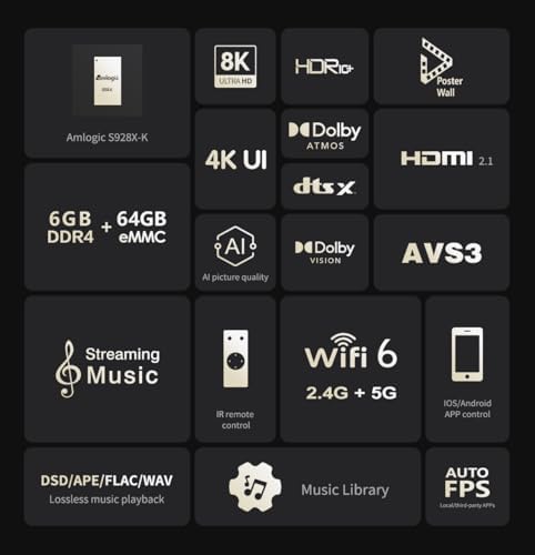 *New generation Amlogic S928X-K 64-bit penta-core A76 + A55 high-performance multi-functional processor. *HDMI 2.1 supports 8K 60Hz point-to-point output, supports HDR (HDR10/HLG/HDR10+/Dolby Vision). *Built-in VS10 image quality engine is highly customizable, significantly improving image quality by custom mapping different video modes. *New Poster Wall 5.0 supports movie trailers and user-friendly custom classification and management. *Supports lossless music playback in formats like DSD (SACD ISO, DSF, DFF), WAV, APE, DTS. *Upgraded music player 8.0 with brand new UI main interface, supports lossless playback and decoding, personalized settings, song data matching. *Supports multiple music streaming methods, such as DLNA, Tidal Connect, etc. *Processing HDR10 static metadata (MaxFall, MaxCll) more accurately which shows higher brightness and deeper darkness level. *Supports acquiring and processing HDR10+ dynamic metadata, colors and brightness are processed frame by frame and scene by scene. *Advanced Dolby Vision technology supports LLDV (Player Led) and Standard mode (TV Led) output. *Automatic frame rate 23.976 and resolution switching output ensures smooth movie playback without interruption (supports local playback and online streaming). *Supports BD/UHD Blu-ray menu playback and gapless branching playback of Blu-rays with complex MPLS structure. *Supports special effect subtitles, automatic download of network subtitles; *Supports dual forced subtitles for Blu-ray and MKV. *Supports access to network protocols like NFS, SMB v1/v2/v3, UPnP, Web DAV, and built-in SMB service. *Supports standard WOL function; supports power-on and standby settings. *Supports HDMI 2.1 CEC control, RS232 control, Control 4, seamless integration into smart home. *Supports the exclusive Zidoo Controller APP for iOS and Android mobile phones, iPad landscape mode and Android tablet landscape mode, which can seamlessly play and control Zidoo media players.
