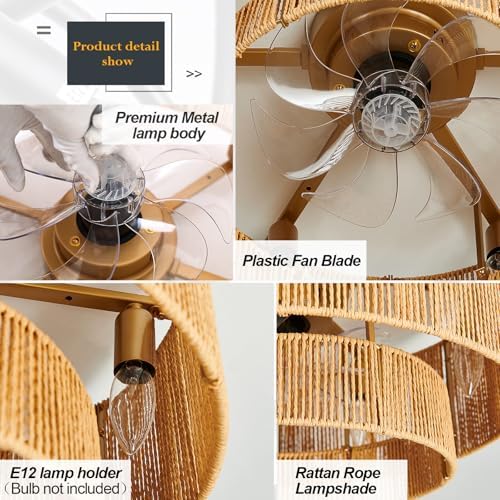 Boho Ceiling Fan with Light Rattan Flush Mount Ceiling Fans with Remote Control 20 Inch Enclosed 7 Speeds for Bedroom Living Room Kitchen Farmhouse Dining Room
