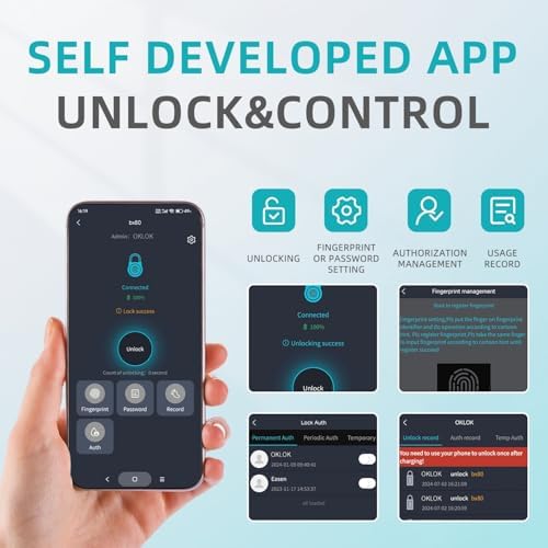 • 【CONVENIENT & EFFICIENT】Connect the smart padlock to the free app via Bluetooth. You can use the app to register fingerprints, unlock, set up authorized users, monitor unlock records, etc., so that the control is in your hands anytime, anywhere.