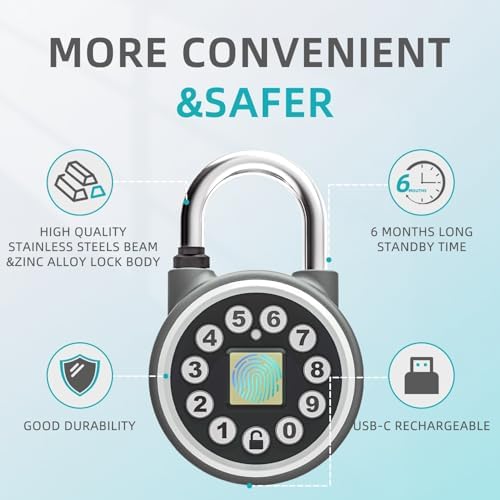 • 【LIGHTWEIGHT & PORTABLE & VERSATILE】Small 0.45 lbs fingerprint padlock is stylishly compact and lightweight, takes up little space and is easy to carry around. Stunning design has great compatibility. Suitable for indoor and outdoor use, such as gym lockers, luggage lockers, school lockers, bicycles, storage and, gates, fences, garages and more!