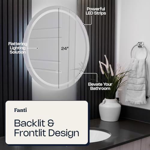 24" Round LED Bathroom Mirror with Lights by Fanti – Wall-Mounted Vanity Mirror, Smart Touch, Anti-Fog, Dimmable, Front & Backlit, Modern Frameless LED Mirror for Bathroom Vanity