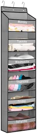 - Weekly closet organizer and storage comes with 3 hooks to easily fit the standard size door, making it stable when picking and putting clothes. Baseball caps organizer has plastic board on each layer so it can fully bear the weight of a week's clothes, more durable than other similar products with cardboard.