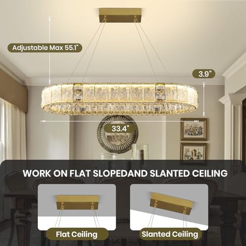 Modern Gold Crystal Chandelier, 33.4" Dimmable LED Oval Pendant Light with Ripple Glass for Dining Room, Kitchen Island, Living Room, Contemporary Luxury Chandelier Fixture