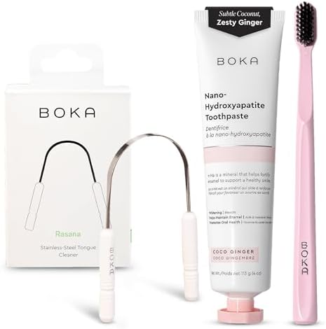 Boka Fluoride Free Toothpaste - Nano Hydroxyapatite - Coco Ginger 4oz, Classic Manual Toothbrush, Pink and Tongue Scraper for Adults & Kids with Case