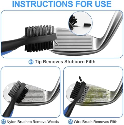 - EFFICIENT CLEANING DESIGN: Our golf brush and grooves cleaner contains 2 brushes, nylon bristles to remove dust or weeds from the surface of the golf club, metal bristles to remove soil from the surface of the golf club, and pointy tines to deep clean the grooves and golf shoes, saving you and your family time and money by eliminating the need for other tools to clean the clubs