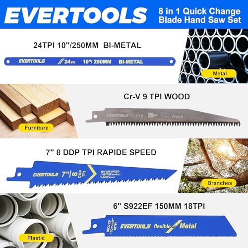 - [ High quality Blades ]- Include 8 different saw blades witch are made of Cr-v steel and high speed steel (HSS steel), be very resistant, sharpened tip and hardened blade for durability. Three-edge teeth, ground teeth and milled teeth to meet the needs of different materials, 7" TPI uses head sharpening technology to facilitate cutting materials at any time.